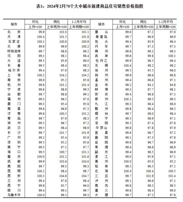 2024年2月70個(gè)大中城市新建商品住宅銷售價(jià)格指數(shù)。 截圖自國(guó)家統(tǒng)計(jì)局官網(wǎng)