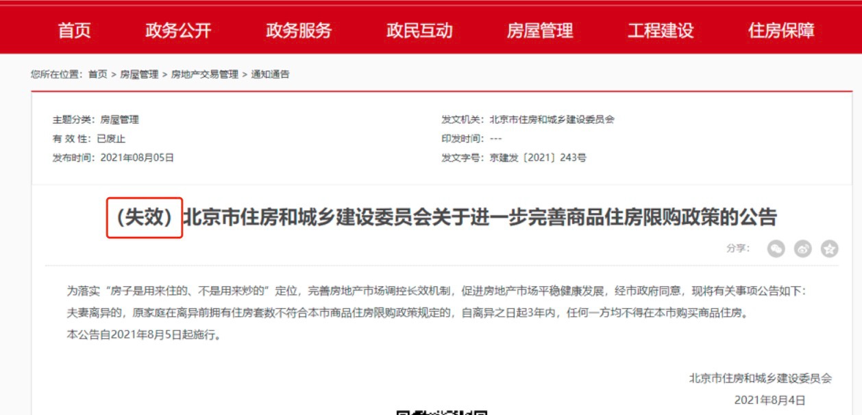 2021年8月4日,北京市住建委發(fā)文規(guī)定,夫妻離異的,原家庭在離異前擁有住房套數(shù)不符合本市商品住房限購政策規(guī)定的,自離異之日起3年內,任何一方均不得在本市購買商品住房。