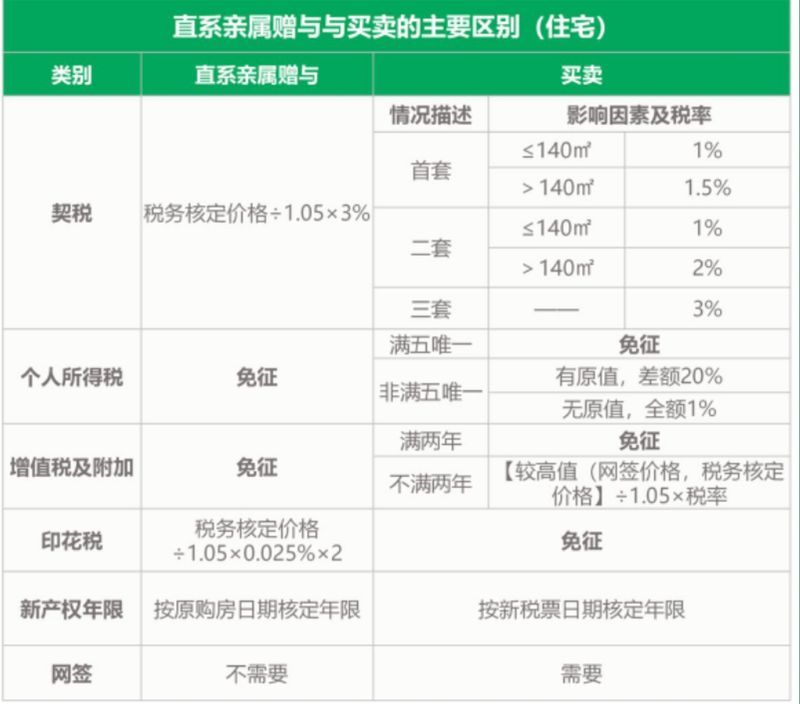 對此,北京鏈家簽約服務(wù)中心相關(guān)負責(zé)人表示,在直系親屬間進行房屋轉(zhuǎn)移(過戶)時,贈與和買賣是兩種常見的方式。雖然它們的目的相似,但在稅費方面卻存在顯著的區(qū)別。其中,贈與方式涉及契稅、印花稅,買賣方式則涉及契稅、個人所得稅、增值稅及附加、印花稅,具體可見下表。