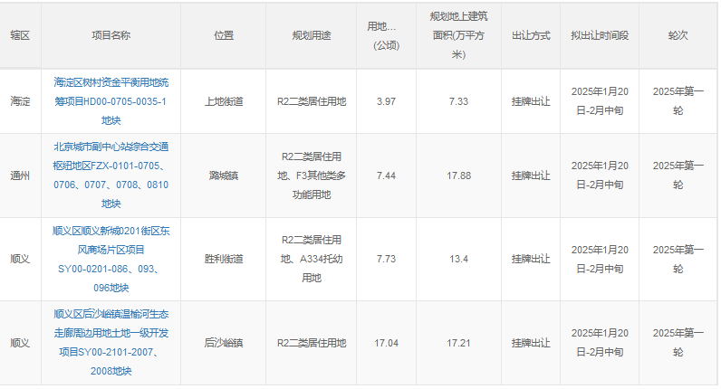 同一天,北京市規(guī)劃和自然資源委員會(huì)網(wǎng)站發(fā)布了2025年度第一輪擬供應(yīng)商品住宅用地清單,共涉及4宗地,土地面積約36.18公頃,建筑規(guī)模約55.82萬(wàn)平方米,將于2025年2月中旬供應(yīng)。整體來看,本輪推出地塊均位于市場(chǎng)需求突出、基礎(chǔ)設(shè)施和公共服務(wù)配套較好的區(qū)域,共涉及海淀、城市副中心、順義新城和后沙峪4宗地。