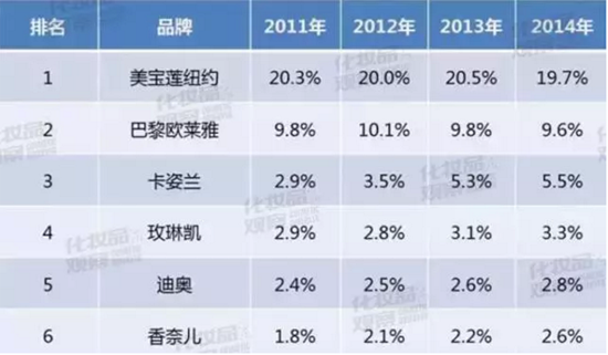 2014年,美寶蓮在中國(guó)的零售額到達(dá)了40億人民幣,而且以遠(yuǎn)超其他品牌的市場(chǎng)占有率穩(wěn)居中國(guó)彩妝市場(chǎng)第一位的位置。但隨著國(guó)內(nèi)本土彩妝的興起及現(xiàn)有彩妝市場(chǎng)的飽和,美寶蓮在經(jīng)歷野蠻生長(zhǎng)期后增長(zhǎng)速度開始放緩。