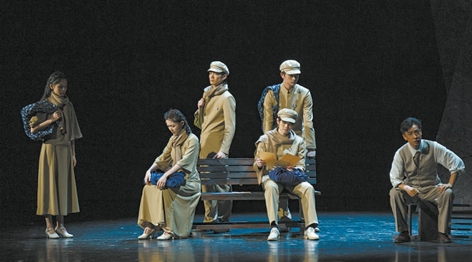 舞美設(shè)計(jì)需要構(gòu)建出復(fù)雜廣闊的時(shí)間和空間內(nèi)容范疇。多組道具營(yíng)造出了多層次的視覺(jué)空間,結(jié)合話劇本身的語(yǔ)言邏輯共同推進(jìn)情節(jié),有回溯有瞻望。舞臺(tái)上三組沿幕側(cè)幕,以扭曲傾倒的造型和鐵銹斑斑的質(zhì)感,營(yíng)造出危險(xiǎn)動(dòng)蕩的革命時(shí)代氛圍。對(duì)于影響新中國(guó)文藝發(fā)展歷程的幾部經(jīng)典作品,通過(guò)呈現(xiàn)其創(chuàng)作過(guò)程,指向漸趨明朗的人物命運(yùn)。相隔數(shù)年、不同角色的命運(yùn)情境得以靈動(dòng)地銜接、組合,人物在時(shí)空中不斷跳進(jìn)跳出,實(shí)現(xiàn)敘述的自由。