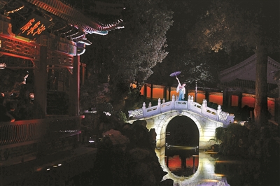 靜心齋與昆曲有著深厚的歷史淵源。明清時期,昆曲演出就已納入宮廷文化的范疇。在靜心齋西跨院潺潺的流水聲和光影變幻中,游客還將邂逅昆曲《牡丹亭》中最引人入勝的經(jīng)典選段《游園驚夢》。亭臺樓閣,假山疊石,美輪美奐,妙不可言。繼續(xù)往里走,在小玉帶橋上,舞者持傘翩然而舞,以傘遮面,時而高舉傘,時而開合傘,《雨碎江南》舞蹈讓人看得陶醉。