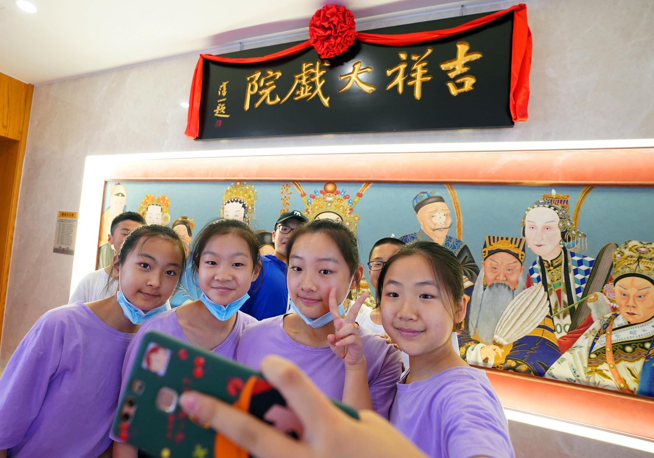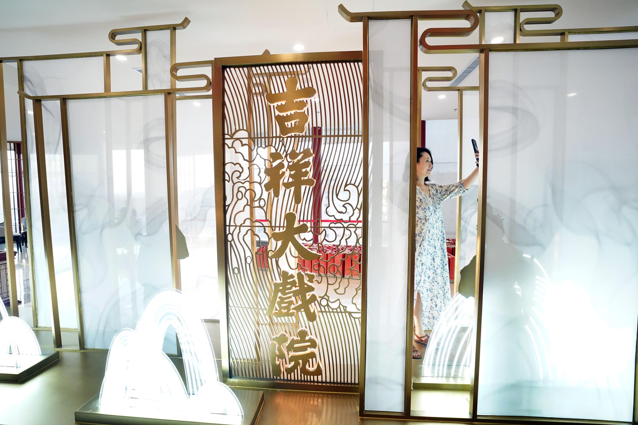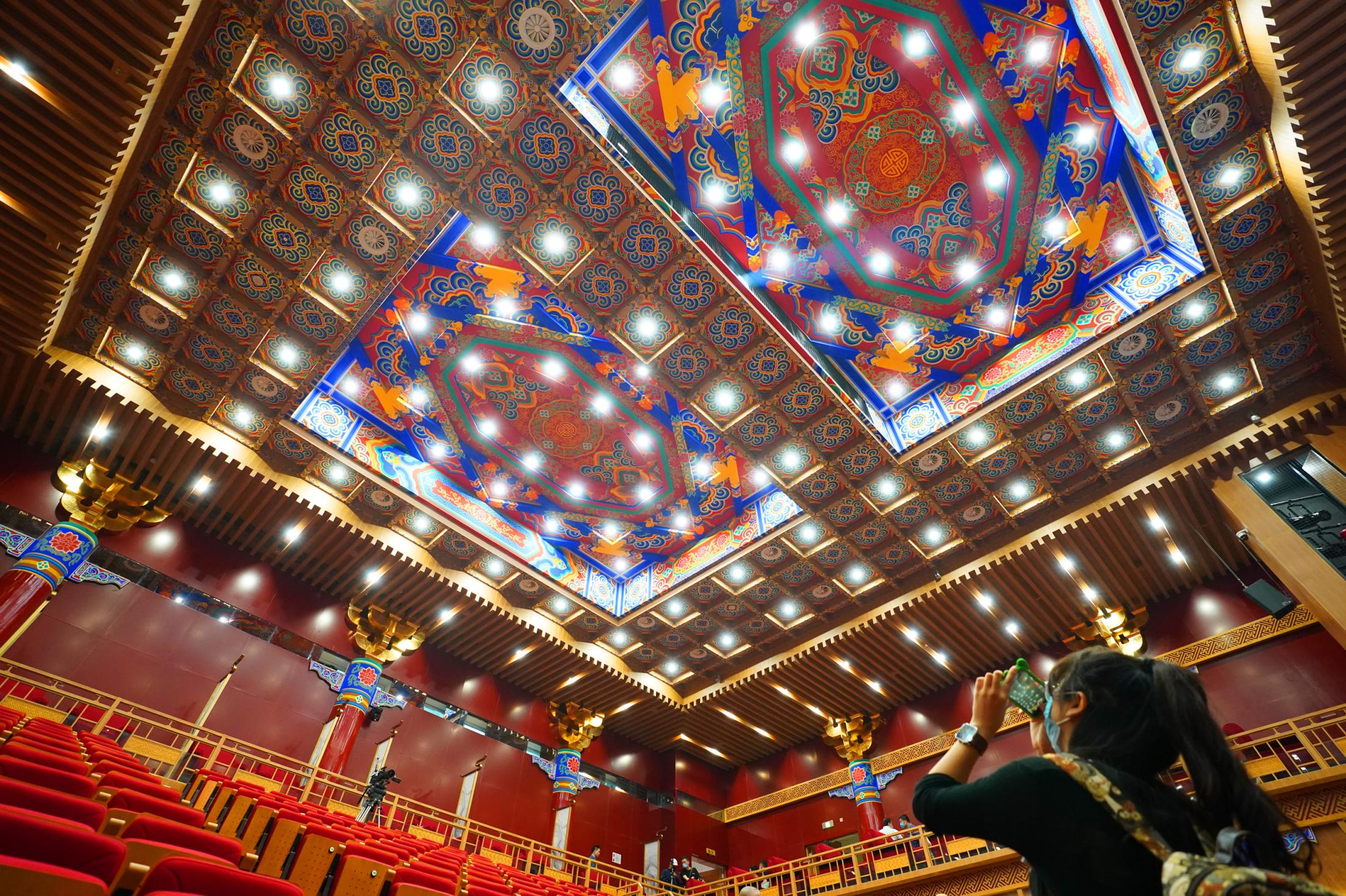 2021年7月9日,時(shí)隔28年,由北京市文化和旅游局、北京市國有資產(chǎn)經(jīng)營有限責(zé)任公司共同出資,北京京劇院、北京市演出有限責(zé)任公司共同運(yùn)營的吉祥大戲院重張啟幕。這座“藏身”于銀泰in88大廈7層、8層的空中戲院占地面積達(dá)4000平方米。乘電梯上樓,初入眼簾的前廳清新雅致,落地窗外可見王府井熙攘的人群與遠(yuǎn)處故宮、景山等古都風(fēng)光;劇場內(nèi),明清風(fēng)格古樸莊重,藻井彩繪繁復(fù)斑斕,傳統(tǒng)的“旋子彩繪”上增加了大量寓意吉祥的“萬字不到頭”圖案,與戲院的名字彼此呼應(yīng)。