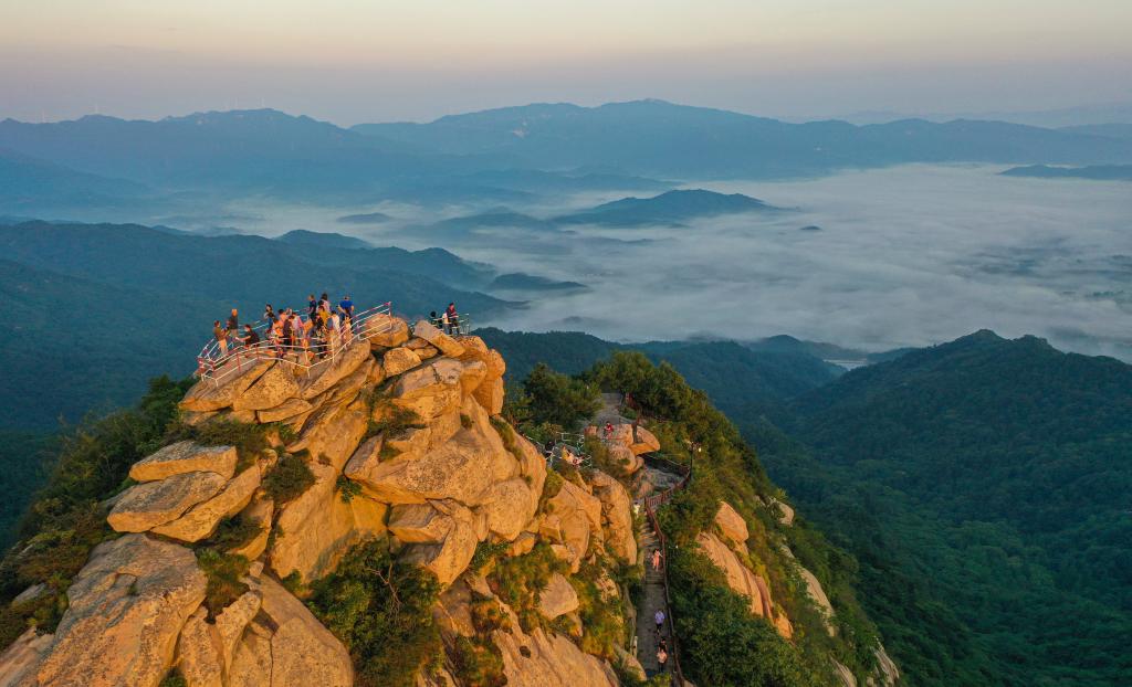 游人登上報(bào)曉峰眺望遠(yuǎn)方。(受訪單位供圖) 雞公山景區(qū)的工作人員李峰說,越來越多的人喜歡遠(yuǎn)離城市的喧鬧來到雞公山,拉開窗簾就能看到山林水色,流連美景慢享假期。八月的夜晚登上報(bào)曉峰,抬頭仰望滿天繁星、云海星河,不失為一種享受。