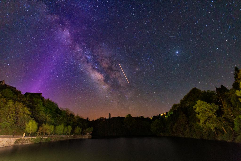 攝影愛好者在報(bào)曉峰上拍攝的星空。(受訪單位供圖) 據(jù)天文專家介紹,北半球三大流星雨之一的英仙座流星雨,每年7月17日至8月24日公眾都有可能觀測到它的蹤跡,今年該流星雨將在8月13日迎來極大。英仙座流星雨速度快、亮流星多、余痕明顯、顏色豐富,是最適宜非專業(yè)觀測者欣賞的流星雨。一位來自鄭州的天文愛好者說,尋雞公山上一處開闊平臺,13日晚至14日凌晨,只要天氣晴朗,用肉眼就能看到。