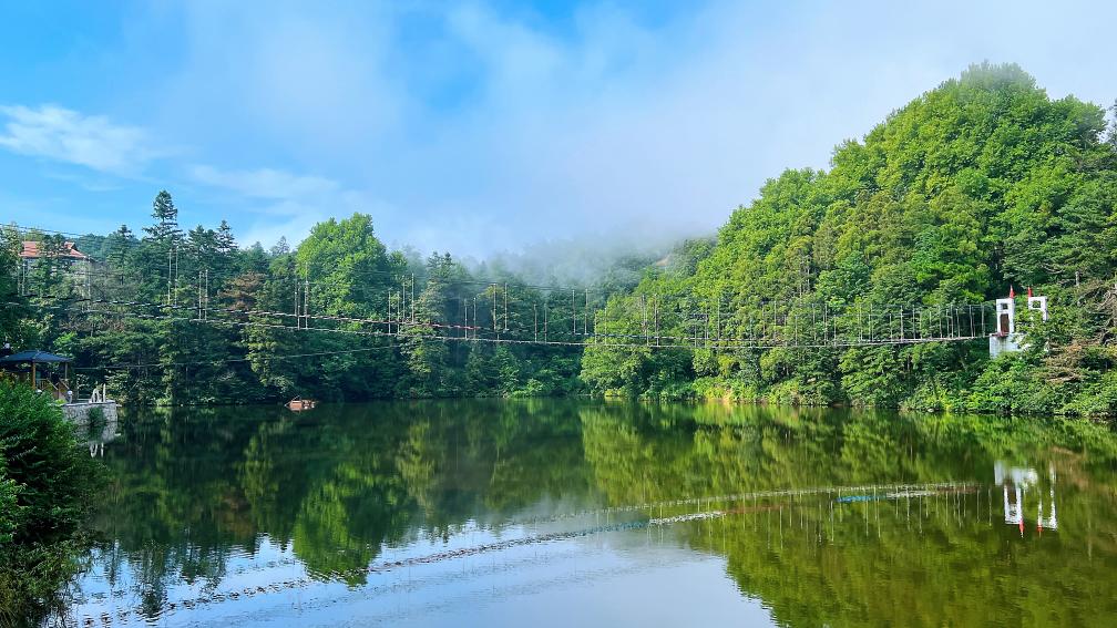“像音符一樣蘇醒,整片天空做背景。背起行囊的這個(gè)剪影,旅程孤獨(dú)而堅(jiān)定……”周六傍晚,落日余暉染紅了天空,一首《在路上》的歌曲在雞公山的萬國廣場上響起。游客們走出山間、湖邊的民宿,歡聚一堂,吹風(fēng)聽歌,放松心情。從北京來此度假的韓先生說,八月的雞公山真是一個(gè)沉浸自然、吟唱詩意的美好去處。 雞公山,位于河南信陽,這里空氣清新,夏季平均氣溫23.7攝氏度?!胺鸸?、云海、霧凇、雨凇、霞光、異國花草、奇峰怪石、瀑布流泉”被稱為這里的八大自然景觀。