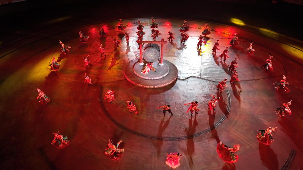 9月20日晚,演員在貴州省雷山縣大塘鎮(zhèn)表演苗族歌舞詩(shī)劇《仰歐?!罚o(wú)人機(jī)照片)。新華社記者 楊文斌 攝