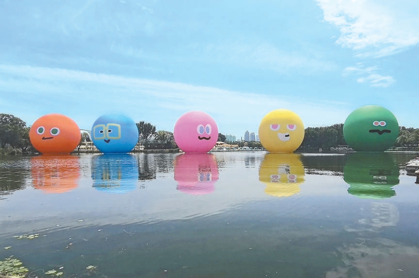 近日,朝陽公園北碼頭附近的湖面上新添五個(gè)10米高的充氣大球,粉色、黃色、綠色等不同顏色,對(duì)應(yīng)的是樂隊(duì)組合五月天的不同成員,也與今年7月25日至8月9日,五月天在鳥巢舉辦演唱會(huì)的舞臺(tái)裝置遙相呼應(yīng)。與此同時(shí),樂隊(duì)成員的人物公仔也分別放置在居庸關(guān)長城、首鋼園、鼓樓廣場(chǎng)、798·751藝術(shù)區(qū)、亮馬河畔等地標(biāo)景點(diǎn)。