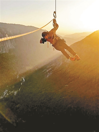 在拍攝過(guò)程中,攝制組除了動(dòng)用無(wú)人機(jī)和直升機(jī)之外,還有8名早早在巖壁各處等候拍攝亞歷克斯攀爬畫面的攝影師,在拍攝時(shí),攝影師背負(fù)幾十斤重的攝影器材和攀登裝備掛在繩索上,隨著拍攝需要快速上下繩索,需具備優(yōu)秀體能和熟練的繩索操作能力。更重要的是,他們不能打擾影響亞歷克斯。高空中的攝影師隨著亞歷克斯一起上升,有幾百米的繩索需要打理,攝影師必須讓繩索整潔地盤在身側(cè),任何失誤都可能造成致命的后果,包括不小心掉落的鏡頭蓋、不小心踢下的石頭。