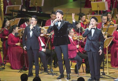 12月2日,《抒情新時(shí)代》慶祝中華人民共和國成立70周年新創(chuàng)主題歌曲音樂會(huì)在北京音樂廳上演,藝術(shù)家們演唱了18首新創(chuàng)歌曲。為了更好地完成這批主題歌曲的創(chuàng)作任務(wù),來自全國各地的近百名藝術(shù)家從西柏坡出發(fā),到延安、古田、湘江、瑞金、井岡山等地采風(fēng),并將這些體驗(yàn)寫進(jìn)了音樂旋律之中。圖為王凱(前中)、廖佳琳(前左)、趙越(前右)演唱《祖國正青春》。