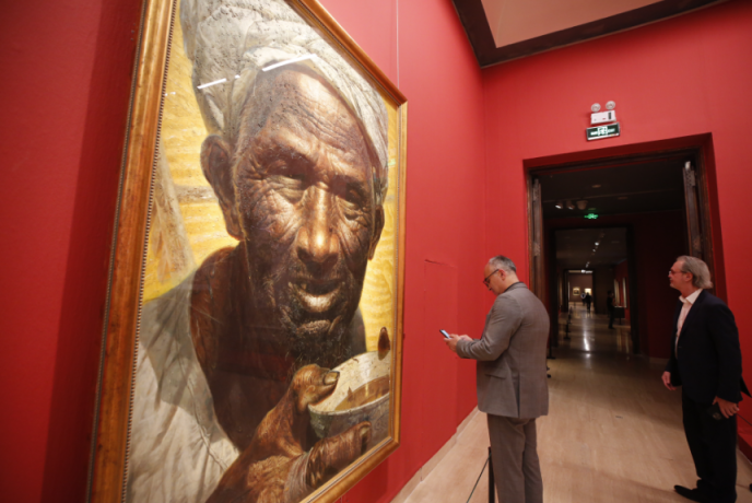 烈日下的一位老農(nóng),在勞動(dòng)的間隙手捧粗瓷碗準(zhǔn)備喝水,大顆晶瑩的汗水流過(guò)他臉上深深的溝壑。展覽展出的羅中立油畫(huà)《父親》以紀(jì)念碑式的宏偉構(gòu)圖、超寫(xiě)實(shí)的手法,飽含深情地刻畫(huà)出中國(guó)農(nóng)民的典型形象。1980年,羅中立以《父親》震撼中國(guó)畫(huà)壇,并獲第二屆全國(guó)青年美展一等獎(jiǎng)。數(shù)十年來(lái),這張臉龐深深打動(dòng)了無(wú)數(shù)中國(guó)人的心,成為改革開(kāi)放以來(lái)中國(guó)現(xiàn)實(shí)主義藝術(shù)創(chuàng)作的一道豐碑。