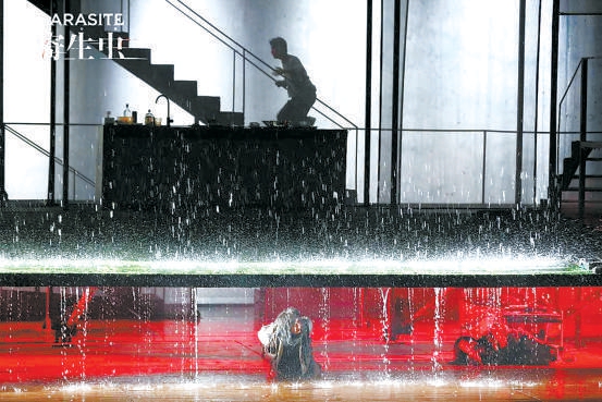 在這方如同社會(huì)切面的舞臺(tái)上,密集的戲劇沖突快速展開。前半部分情緒高漲,金家人的把戲不斷得逞,做起了漫無(wú)邊際的美夢(mèng)。而隨著一場(chǎng)意外的大暴雨,故事急轉(zhuǎn)直下,三家人的矛盾即刻爆發(fā),奔向了格外慘烈的結(jié)局。在兩個(gè)多小時(shí)的表演中,演員們相當(dāng)賣力,飾演金家姐弟的郝蕾與馬天宇都交上了合格的答卷。在對(duì)姐姐金基婷一角的駕馭上,話劇表演經(jīng)驗(yàn)豐富的郝蕾顯然游刃有余,甚至?xí)層^眾感嘆她的演技有些大材小用。首次出演話劇的馬天宇也值得肯定。飾演金家父母的房子斌和趙紅薇堪稱全劇的靈魂,大段的臺(tái)詞、極致的情感落差對(duì)他們的體力和表演功底都提出了相當(dāng)高的要求。謝幕時(shí),觀眾格外熱烈的掌聲是給予演員的最好肯定。舞臺(tái)上,金父應(yīng)聘樸社長(zhǎng)司機(jī)、所有人為樸家小兒子演出慶生小戲劇等片段運(yùn)用了相當(dāng)風(fēng)格化的表演方式,在滑稽而悲涼的黑色幽默中,充分展現(xiàn)了舞臺(tái)藝術(shù)區(qū)別于電影的獨(dú)特虛擬性和表現(xiàn)力。