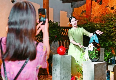 福建福州,觀眾在三坊七巷歷史文化街區(qū)參觀拍攝傳統(tǒng)漆器工藝品的沉浸式實景展示。新華社發(fā)