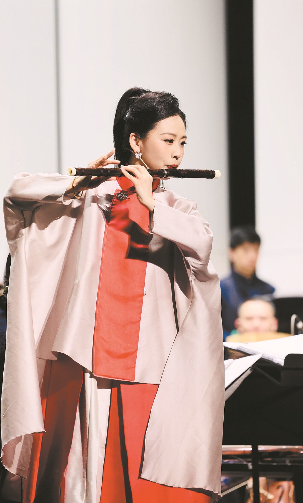 29歲的笛簫演奏家王澤上演李博禪作曲的《云水三章》。這首誕生于2023年的新作分為“向天邊的云”“向水中的葉”“向遠(yuǎn)方的人”三部分,展現(xiàn)了曲笛、梆笛、新笛和簫的不同技巧和音樂特色,表達(dá)不同的人生意境。28歲的高雅演奏的是郭文景作曲的《愁空山》,這部作品被譽(yù)為竹笛界“最具演奏難度的曲目之一”。高雅迎難而上,不僅傳達(dá)了作品雄渾、厚重的精神內(nèi)核,又呈現(xiàn)出細(xì)膩感和層次感。