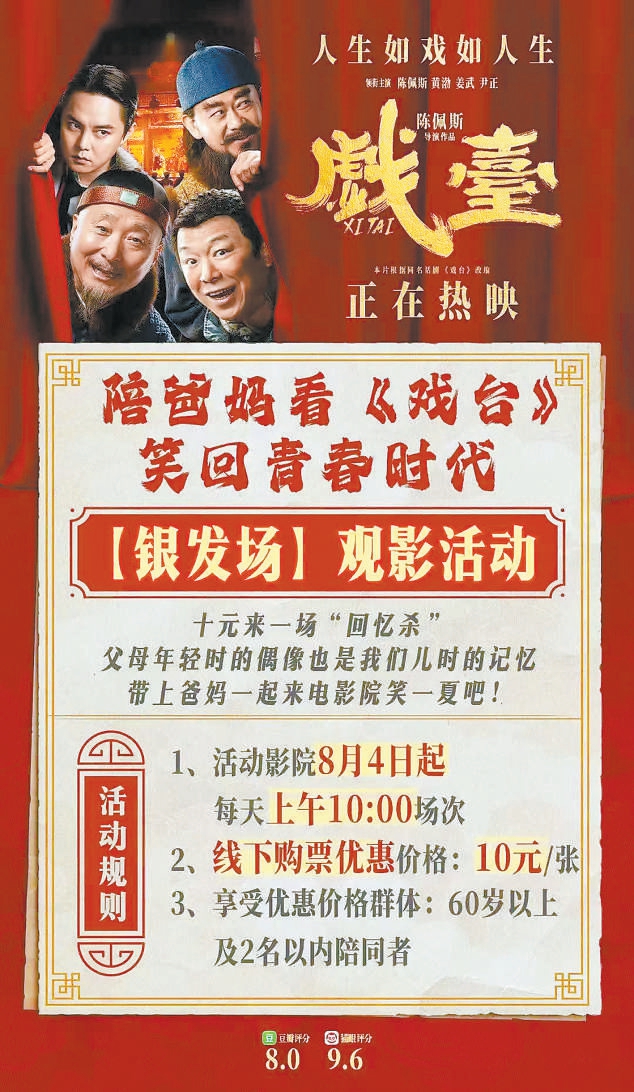 《戲臺(tái)》則推出“銀發(fā)場(chǎng)”特惠活動(dòng)?!靶Ч貏e好,線上線下都傳開了,很多觀眾打電話來(lái)咨詢?!瘪T賀楠說(shuō),北京大約四分之一的影院都有“銀發(fā)場(chǎng)”,他所在影院的“銀發(fā)場(chǎng)”上座率在《戲臺(tái)》所有場(chǎng)次中是最高的。 (北京晚報(bào)記者 袁云兒)