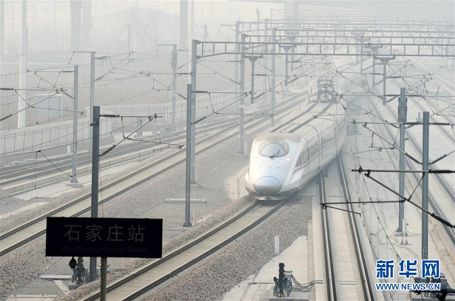 一輛動車組列車駛離石家莊火車站(1月9日攝)。 1月10日零時起,全國鐵路實行新的列車運(yùn)行圖,增開旅客列車285.5對,其中增開動車組列車281.5對。運(yùn)行圖調(diào)整后,全國鐵路開行旅客列車總數(shù)達(dá)到3142對,其中動車組列車1980.5對。新華社記者 牟宇 攝