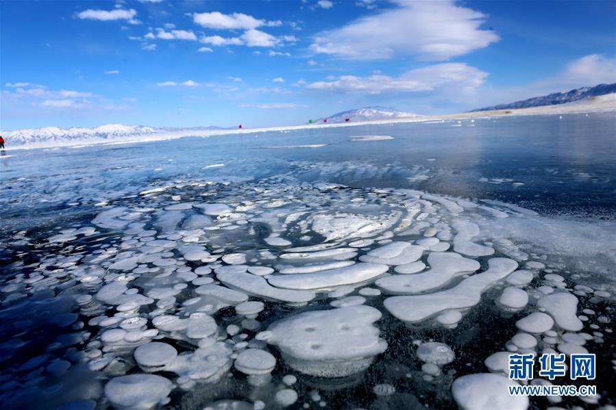 2月20日在新疆博爾塔拉蒙古自治州境內的賽里木湖拍攝的湖面結冰后形成的冰花奇觀。進入2月份后,新疆海拔最高的湖泊賽里木湖湖面全部結冰,在湖邊的一些小泉眼處,不停泛出的氣泡在冷空氣作用下,迅速凝結,形成了如冰柱、螺旋紋等形式多樣的冰花奇觀,令人嘆為觀止。新華社發(fā)(沈志君 攝)