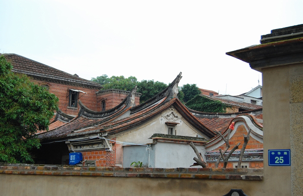 在大量的華僑洋樓建設(shè)中,體現(xiàn)出一些新風(fēng)尚:一方面,立面上采用紅磚墻與少量白色線(xiàn)條對(duì)比的手法蔚然成風(fēng),延續(xù)了閩南紅磚厝紅磚白石的裝飾傳統(tǒng);另一方面,以裝飾藝術(shù)風(fēng)格為代表的裝飾元素逐漸流行,并融合常見(jiàn)的傳統(tǒng)裝飾題材及西方古典裝飾元素。