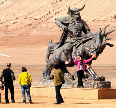 下車之后的第一站便是“西游文化長廊”,長廊之中安置了二十四幅《西游記》中經典故事的壁畫。在“三借芭蕉扇”的畫前駐足,畫中的猴哥栩栩如生,看著墻上的故事,想想剛才見到的奇景,此行便越發(fā)興味盎然。走出展廳,進入廣場,眼前一根高大筆直的金箍棒吸引了我的視線,難不成是猴哥當年用金箍棒換了鐵扇公主的芭蕉扇不成?實際上,這是一根溫度計,上面顯示著實時溫度,讓人直觀地感受著這里的酷熱。