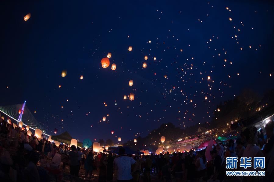 當日,各族群眾和國內(nèi)外游客在云南西雙版納景洪市瀾滄江畔放飛孔明燈,喜迎傣歷1378年新年。