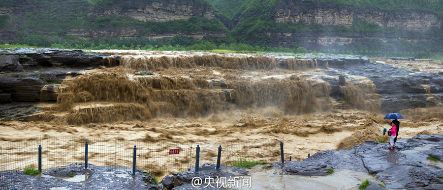 受上游強(qiáng)降雨和水庫(kù)放水影響,最近幾天,黃河壺口瀑布迎來(lái)伏汛,最大水流量達(dá)到每秒2600立方米左右,濁流滾滾奔騰而下,氣勢(shì)磅礴?。ㄑ胍曈浾呃钪?文豪)