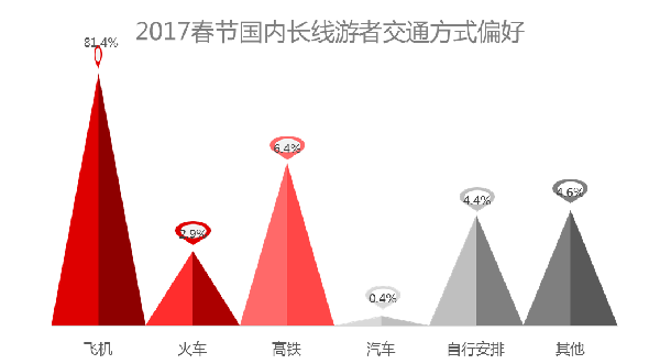 出游交通工具選擇方面,81.4%的國內(nèi)長線游者選擇了飛機(jī)(選擇了以飛機(jī)為交通方式的旅游團(tuán)或自由行套餐),其次是高鐵,占比6.4%。