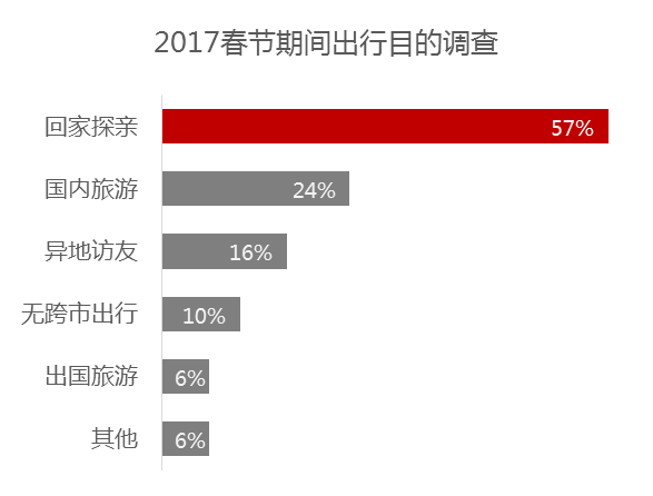《報告》關(guān)于2017年春節(jié)跨市出行(長途出行)意愿的在線問卷調(diào)查數(shù)據(jù)顯示,“回家探親”是受訪者春節(jié)期間長途出行的第一大動機(jī),“國內(nèi)旅游”則是第二大出行動機(jī)??傮w而言,受訪者能夠明確給出的春節(jié)出行動機(jī)中,除了“回家探親”,就是旅游(國內(nèi)游和出境游)。這表明,居民2017年春節(jié)期間的旅游消費(fèi)意愿強(qiáng)烈,旅游過年已經(jīng)成為較為主流的過年方式。