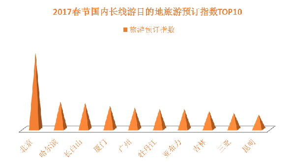 一般情況下,春節(jié)期間的國內(nèi)長線游(行程3日以上,居住地300公里外)需求的出游人數(shù)在總體長線游需求中占比最大?!秷蟾妗窋?shù)據(jù)顯示,北京、哈爾濱、長白山、廈門、廣州、牡丹江、亞布力、吉林、三亞、昆明是2017年春節(jié)期間最熱門的十個目的地(以《報告》發(fā)布時的線路預(yù)訂數(shù)據(jù)統(tǒng)計),其中哈爾濱、長白山、牡丹江、亞布力、吉林五個目的地全部來自東北地區(qū),春節(jié)期間冰雪游線路的火爆是它們上榜的共同原因,廈門、三亞、昆明等則為黃金周國內(nèi)游傳統(tǒng)熱門目的地。另外,不同城市居民春節(jié)國內(nèi)長線游的目的地偏好略有差異,例如,北京最受歡迎的春節(jié)國內(nèi)游目的地主要有廣州、珠海、哈爾濱、長白山,上海最受歡迎的春節(jié)國內(nèi)游目的地主要有長白山、北海、三亞、北京等,廣州最受歡迎的春節(jié)國內(nèi)游目的地主要有貴陽、張家界等。