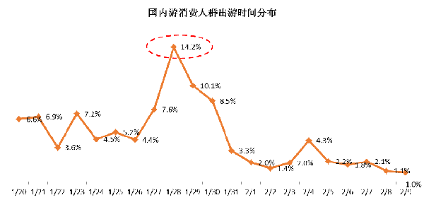 出游時間方面,春節(jié)國內(nèi)長線游者選擇節(jié)前錯峰游的占比38.3%,春節(jié)黃金周期間出游的占比47.2%,1月28日(正月初一)達(dá)到客流峰值,選擇節(jié)后錯峰出游的僅占比14.5%。
