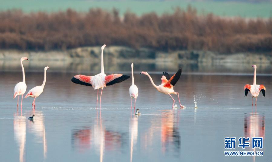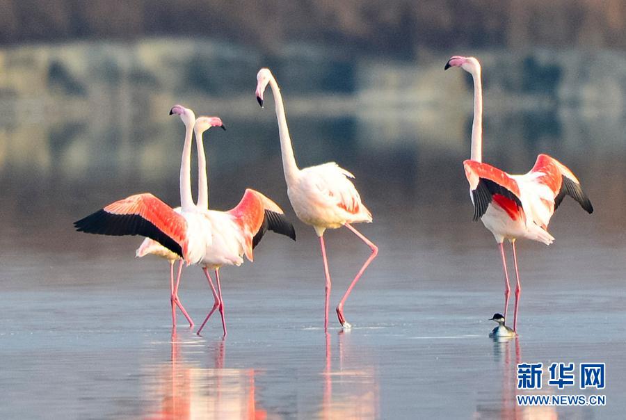 隨著氣溫下降,一些火烈鳥飛抵山西運城鹽湖,成為冬日鹽湖一道美麗的風景。
