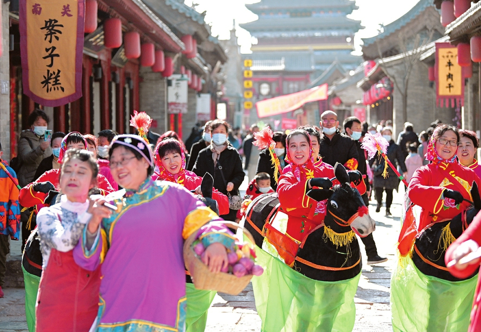 2月17日,忻州古城,民間文藝表演隊(duì)正在街頭巡演。春節(jié)期間,忻州古城舉辦“逛古城、品文化、識忻州”旅游文化活動(dòng),雄獅起舞、八音吹奏、秧歌表演等一系列富有當(dāng)?shù)靥厣拿耖g文藝活動(dòng)精彩紛呈,吸引了眾多旅游者游覽觀賞,整個(gè)古城呈現(xiàn)出一派喜慶祥和的節(jié)日氣氛。