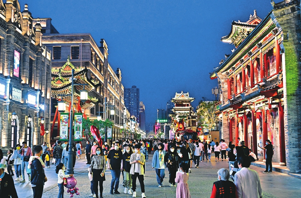 5月15日夜,華燈初上,人們愜意地在太原鐘樓街徜徉。每逢夜幕降臨,鐘樓街上人來人往,青磚綴彩,古風(fēng)悠然,飛檐翹角處霓虹耀閃,古老與時尚在這里交融,歷史與現(xiàn)代在此地“重逢”,五光十色的鐘樓燈光秀,令人目不暇接、流連忘返。