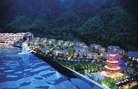 徜徉泳池,可觀落日余暉、滿天星辰,一邊是古風(fēng)古韻的漢唐建筑,一邊是綠意正濃的山林竹間;一半是封存塵世的自然風(fēng)景,一半是觸手可及的浪漫風(fēng)情。俯瞰葛仙村,盡享古韻之美。傍晚,落日余暉均勻曬在水面上,散為金光,而晚霞,也幻成異樣的色彩,一層層的光和色,相互交融著,“落霞與孤鶩齊飛,秋水共長(zhǎng)天一色”的意境就是如此吧。夜里輕柔的晚風(fēng),拂過(guò)泳池,水波粼粼,被周邊的燈光映襯得就像無(wú)數(shù)的水晶鋪設(shè)在水面上,星空與池底交相呼應(yīng),帶來(lái)無(wú)盡的浪漫氣息。