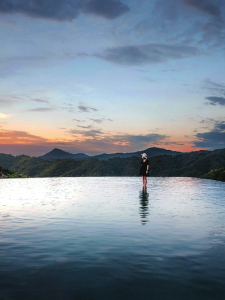 白天,游人可以搭乘索道登上葛仙山,行在山中,可見(jiàn)清泉瑩然,苔蘚盈階、云海翻騰,可聽(tīng)泉水響動(dòng),天色如夢(mèng)變幻。葛仙山的翠竹、樹(shù)木極多,是一道天然的屏障,趕在落日之前,快步來(lái)到葛仙村無(wú)邊泳池,赴一場(chǎng)“橘色云朵+藍(lán)色池水”的浪漫。