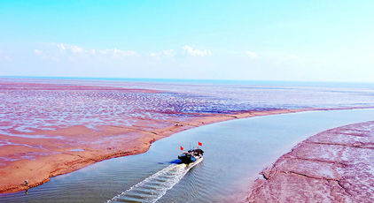 2023年10月10日,航拍山東省東營市東營紅灘濕地旅游區(qū)景色。東營市是全球首批“國際濕地城市”,擁有我國暖溫帶保存最廣闊、最完善、最年輕的濕地生態(tài)系統(tǒng),入秋以來晝夜溫差加大,生長在灘涂上的大片鹽生植物開始由綠轉(zhuǎn)紅,遠遠望去火紅一片,宛若一塊巨大的“紅地毯”。劉智峰攝(人民圖片網(wǎng))
