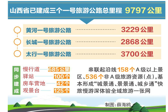 截至今年10月10日,山西省已建成三個(gè)一號(hào)旅游公路總里程9797公里。其中,黃河一號(hào)旅游公路3229公里、長(zhǎng)城一號(hào)旅游公路2868公里、太行一號(hào)旅游公路3700公里,同步建成慢行道685公里、驛站100個(gè)、房車營(yíng)地42個(gè)、觀景臺(tái)125個(gè),串聯(lián)起沿線158個(gè)A級(jí)以上景區(qū)、536個(gè)非A級(jí)旅游資源(點(diǎn)),基本形成“城景通、景景通、城鄉(xiāng)通”快旅慢游深體驗(yàn)全域旅游一張網(wǎng)。
