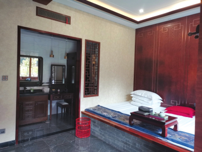 這里的房間比一般客棧寬敞許多,而且每間房都風格迥異,比如有的床頭是充滿意境的書畫,有的床頭是雕刻花紋的木板,有的多了古典桌椅,有的放置了茶幾,有的則多了沙發(fā)、屏風或條幾、膽瓶……每間房都融合了寧靜與古樸的元素,屋子里擺放的瓷壇和衣柜等老物件寫滿歲月的痕跡。