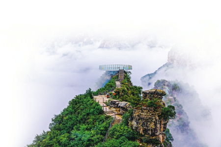 出玻璃棧道后向下走大約2分鐘,會(huì)相繼遇到兩處岔路口,不要轉(zhuǎn)彎,繼續(xù)直行2分鐘即可到達(dá)天露臺(tái),位于仙人峰最高處的它是俯瞰大峽谷的絕佳之處,天露臺(tái)下臨絕壑,凌空憑虛,原來在谷底看起來直插云天的峭壁山峰,都匍匐在腳下,頗有一覽眾山小之感。南太行的雄渾大氣在此被展現(xiàn)得淋漓盡致。