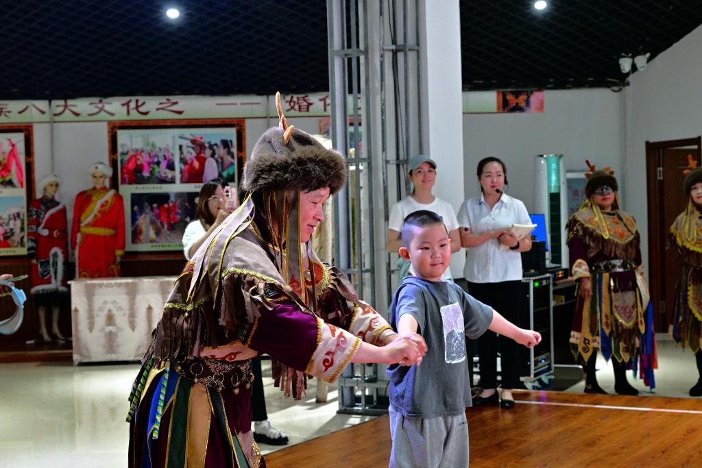 在展示館二樓活態(tài)展示區(qū),赫哲族演員頭戴鹿角帽,身穿民族服裝,跳起熱烈的“溫吉尼”舞蹈,為前來(lái)參觀的游客帶來(lái)一場(chǎng)神秘又震撼的視聽(tīng)盛宴。表演結(jié)束后,游客還可以走上舞臺(tái),和演員們學(xué)習(xí)薩滿舞的舞蹈動(dòng)作,體驗(yàn)赫哲族古老的文化。