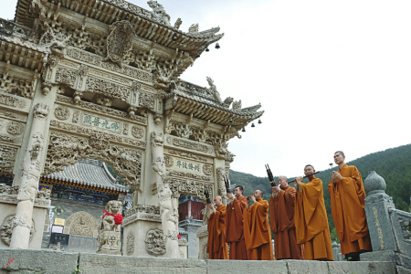 一次五臺(tái)山,五百年因緣。剛到龍泉寺108級(jí)臺(tái)階下,就聽到婉轉(zhuǎn)悠揚(yáng)又直入人心的樂曲聲從高處傳來。走到龍泉寺三寶之一的照壁抬眼向高望去,越過青石臺(tái)階,第二寶石牌坊下,一隊(duì)僧人正在演繹國家級(jí)非物質(zhì)文化遺產(chǎn)五臺(tái)山佛樂。