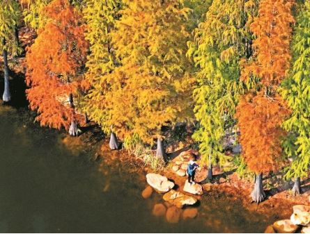 隨著天氣轉(zhuǎn)冷,廣西南寧市多個公園的杉樹樹葉愈發(fā)紅艷,分外靚麗。圖為12月21日,市民在廣西南寧市青秀山風景區(qū)的杉樹林里游玩。 新華社記者 周華攝