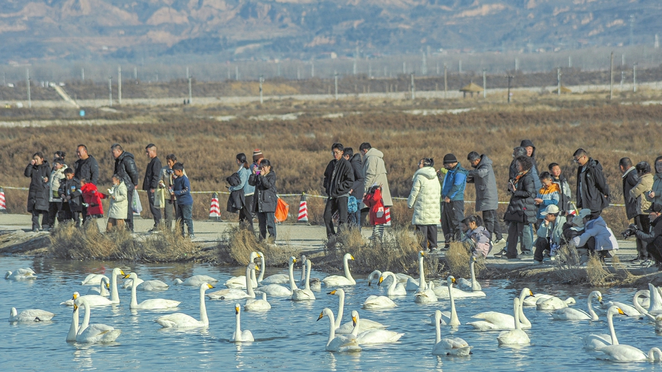 1月12日,人們在運(yùn)城鹽湖近距離觀賞野生大天鵝。入冬以來,運(yùn)城的千年鹽湖迎來一群特殊“訪客”,一大批天鵝在此棲息越冬,鹽湖搖身一變成了“天鵝湖”,與周邊的秀美山色相映成趣,構(gòu)成一幅絕美生態(tài)畫卷,讓千年鹽湖煥發(fā)出別樣生機(jī)。