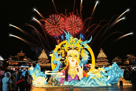 夜幕降臨,園區(qū)瞬間切換至另一番驚艷景象。神州塔下的演藝廣場,將以濃烈的“國風+國潮”風格開啟夜場演出。威風凜凜的舞龍舞獅、婀娜多姿的古典舞蹈等各類表演將輪番上陣,令人目不暇接。隨著演出漸入高潮,夢幻的燈光秀將伴隨著音樂節(jié)奏明滅閃爍,在夜色中勾勒出美輪美奐的光影畫卷。讓人最為期待的煙花秀將壓軸登場。隨著絢麗的煙花轟然沖向夜空,剎那間綻放成五彩斑斕的花火,整個園區(qū)都仿佛被點亮了,沉浸在一種亦真亦幻的絕美氛圍中。