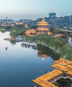 從大雁塔到大唐芙蓉園和大唐不夜城步行10分鐘—15分鐘,可以根據(jù)自己的興趣選擇。兩處都是夜游好去處,十分熱鬧。大唐芙蓉園是我國第一個全方位展示盛唐風貌的大型皇家園林式文化主題公園,紫云樓、仕女館、杏園、芳林苑等仿古建筑,讓人感覺仿佛穿越到了唐朝,身邊穿唐裝游園的游客不少,景與人,都美得好似“世外桃源”,拍照打卡的游客,忙得不亦樂乎。如果想要體驗更多煙火氣,那大唐不夜城的三步一景、五步一鬧無疑是最合適的選擇。每到黃昏,四面八方的人流便向大唐不夜城匯聚,大家一般乘坐地鐵而來,從地鐵大雁塔站東南口出站,從北往南參觀??赐甏笱闼睆V場的音樂噴泉表演,繼續(xù)往前800米,就是大唐不夜城步行街北入口,經(jīng)過古詩詞街時,一步一詩詞,成為獨屬于長安的浪漫。