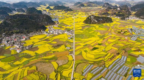 近日,貴州省六盤水市六枝特區(qū)木崗鎮(zhèn)的15000余畝油菜花競相綻放。金黃的油菜花同田地、道路、民居構(gòu)成一幅幅美麗的春日畫卷。