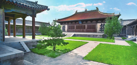 永安寺,原稱渾源州永安禪寺及神州大永安禪寺,俗稱“大寺”,始建于金,金元之交被火毀后重建,明、清以來均曾在當?shù)毓賳T倡導下續(xù)建與增修。該寺位于渾源古城東北隅,坐西北朝東南,本為以中軸線為主,東西軸各輔以跨院或偏院的五進場院空間大型寺廟建筑群,現(xiàn)僅存前院及東西跨院和中院主體建筑群,東西寬52米,南北深78米,占地面積4056平方米。寺內現(xiàn)存文物建筑物7座、清代壁畫305.4平方米、建筑彩畫2118平方米,古代碑碣2方,石獅一對。主殿傳法正宗殿為元延祐二年(1315年)原構,是我國建筑史上廡殿頂建筑的杰作,殿內滿堂水陸畫、建筑彩畫及殿頂五彩琉璃均保存完好且異常精美,聞名遐邇。