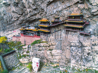 懸空寺位于恒山第二主峰翠屏峰的半崖峭壁間,始建于北魏后期,距今已有1500多年的歷史。整個建筑上載危巖,下臨深谷,樓閣懸空,結構奇巧,是我國古建筑中罕見的杰作,堪稱“天下一絕”。詩仙李白游懸空寺后揮毫寫下“壯觀”二字,以表其懷。明代旅行家徐霞客在其著作《徐霞客游記》中稱贊懸空寺為“天下巨觀”。歷史文化名城保護委員會副主任、著名文物專家鄭孝燮視察懸空寺后題詞:“懸空寺玄、絕、奇、險,百來百看不厭”。