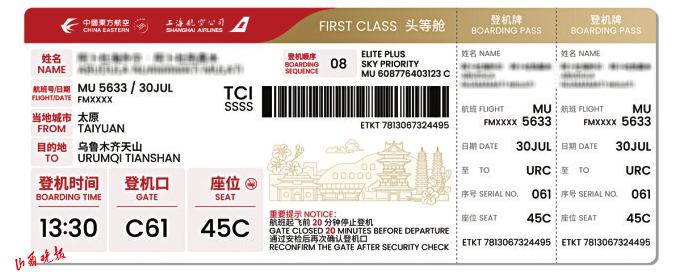 此次升級(jí)不僅注重文化表達(dá),更著力提升服務(wù)體驗(yàn)。登機(jī)牌對(duì)登機(jī)口、起飛時(shí)間、座位號(hào)等關(guān)鍵信息進(jìn)行了“放大提亮”處理,通過(guò)字體加粗、色彩對(duì)比等設(shè)計(jì),顯著提升了信息辨識(shí)度,特別方便老年旅客快速獲取信息,有效降低誤機(jī)風(fēng)險(xiǎn),體現(xiàn)了東航精細(xì)化服務(wù)理念。