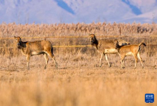 這是11月4日在寧夏青銅峽庫區(qū)濕地自然保護區(qū)內拍攝的麋鹿和麋鹿幼崽(右)。